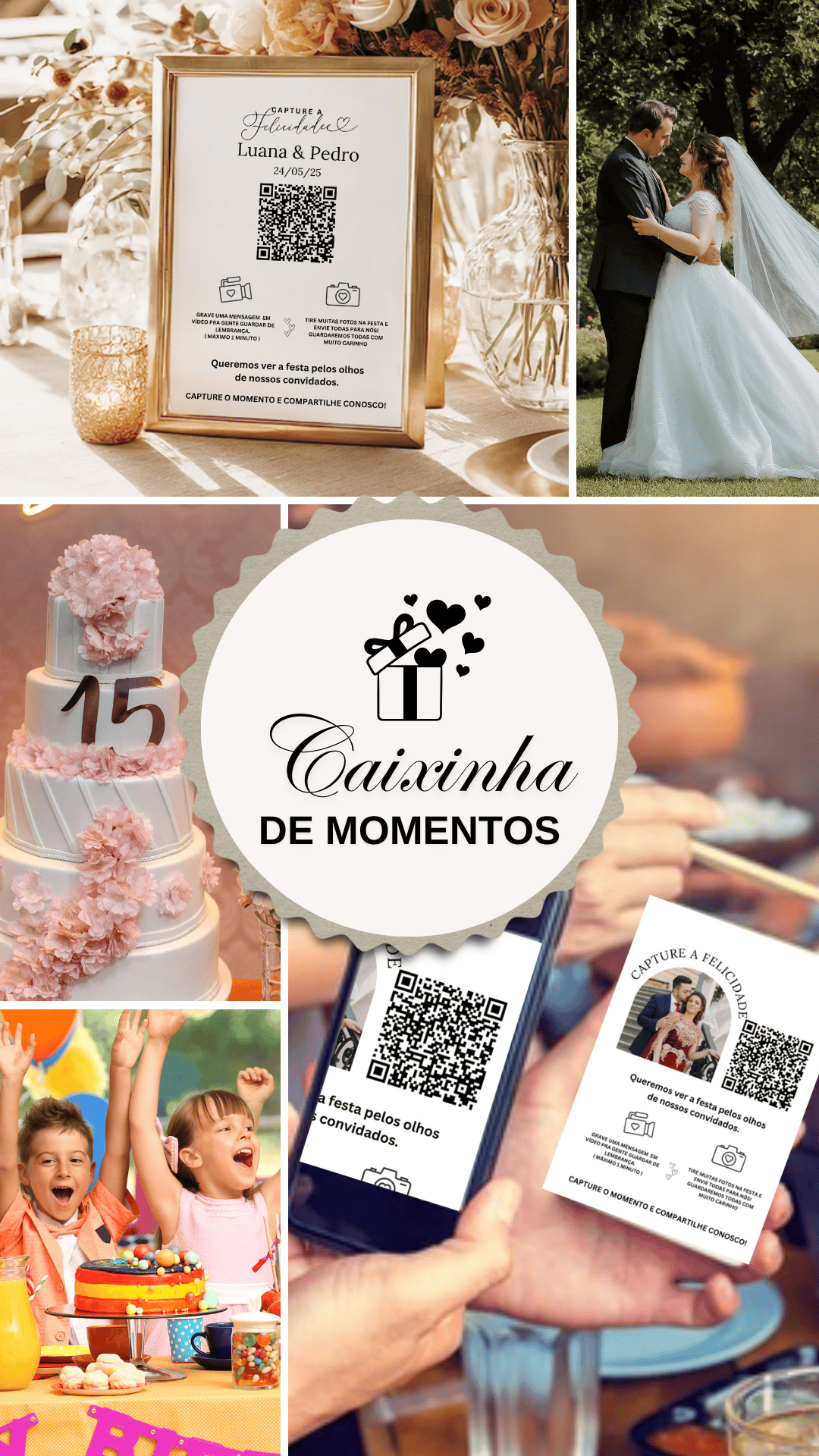Nossa Caixinha de Momentos é um álbum de fotos compartilhado onde seus convidados podem adicionar e compartilhar todas as fotos e vídeos tirados durante a sua festa, sem precisar baixar nenhum aplicativo.